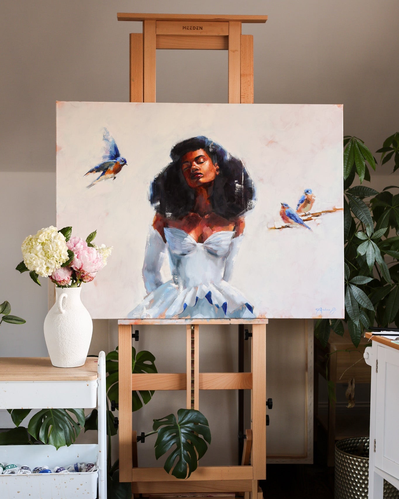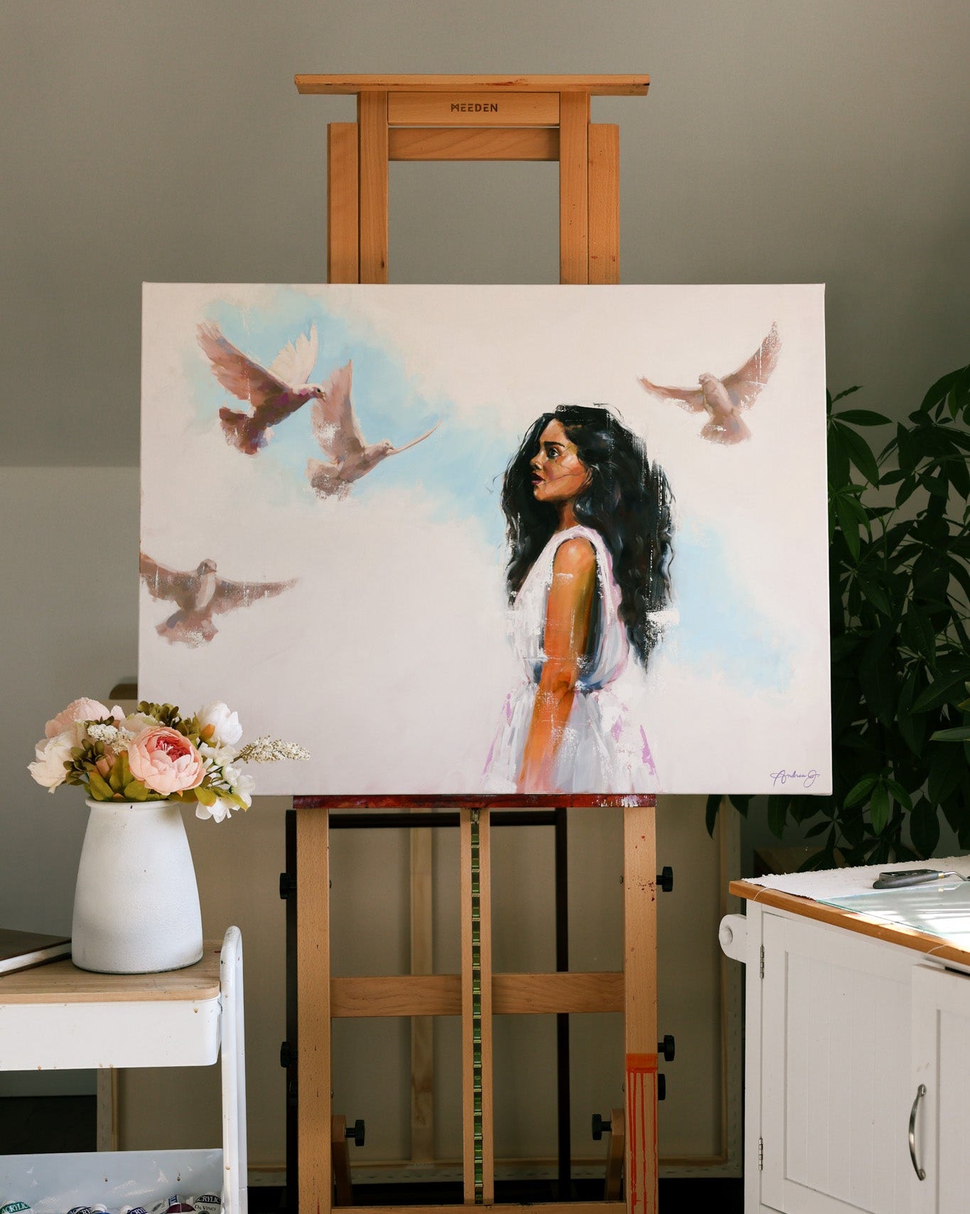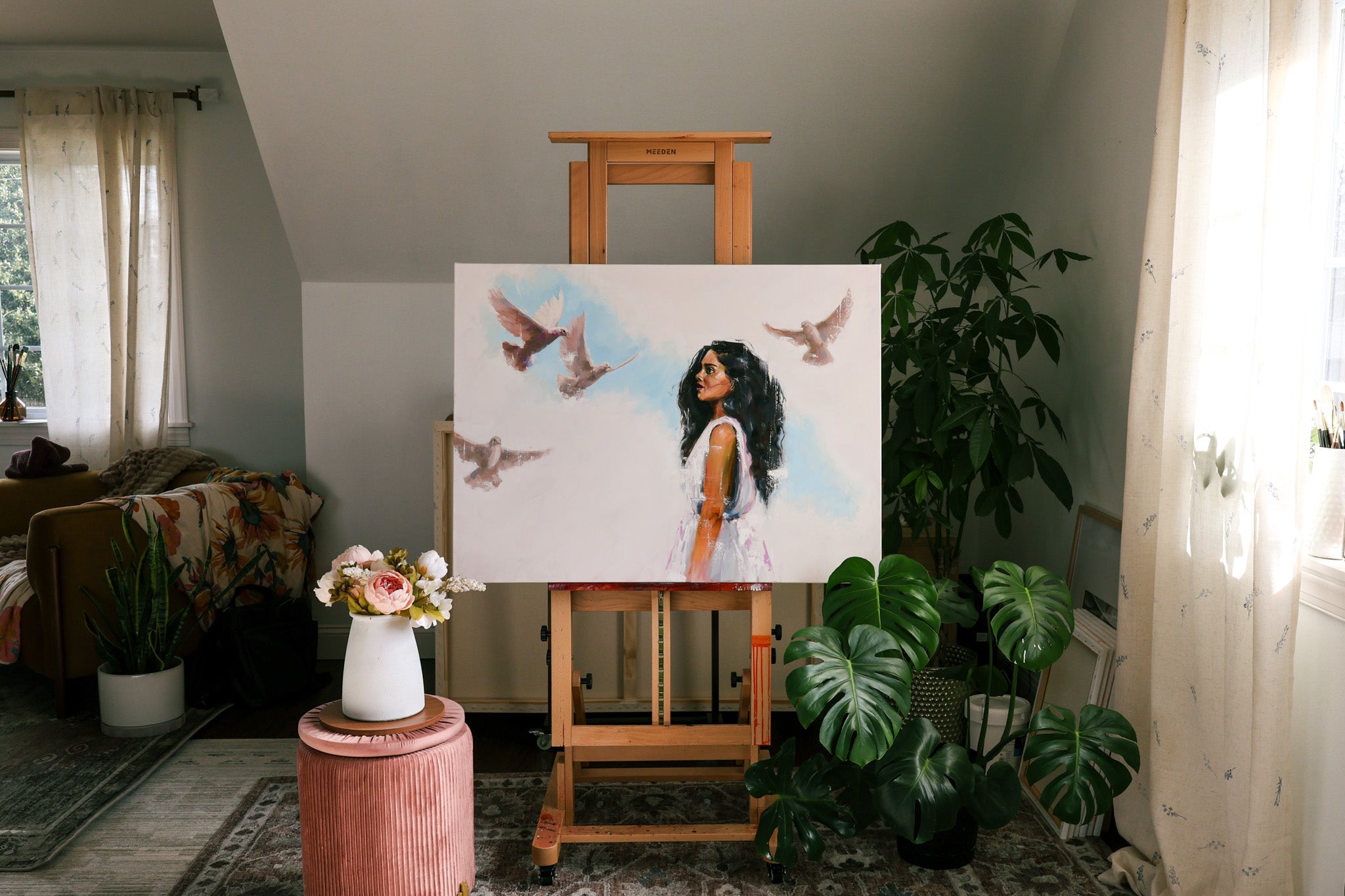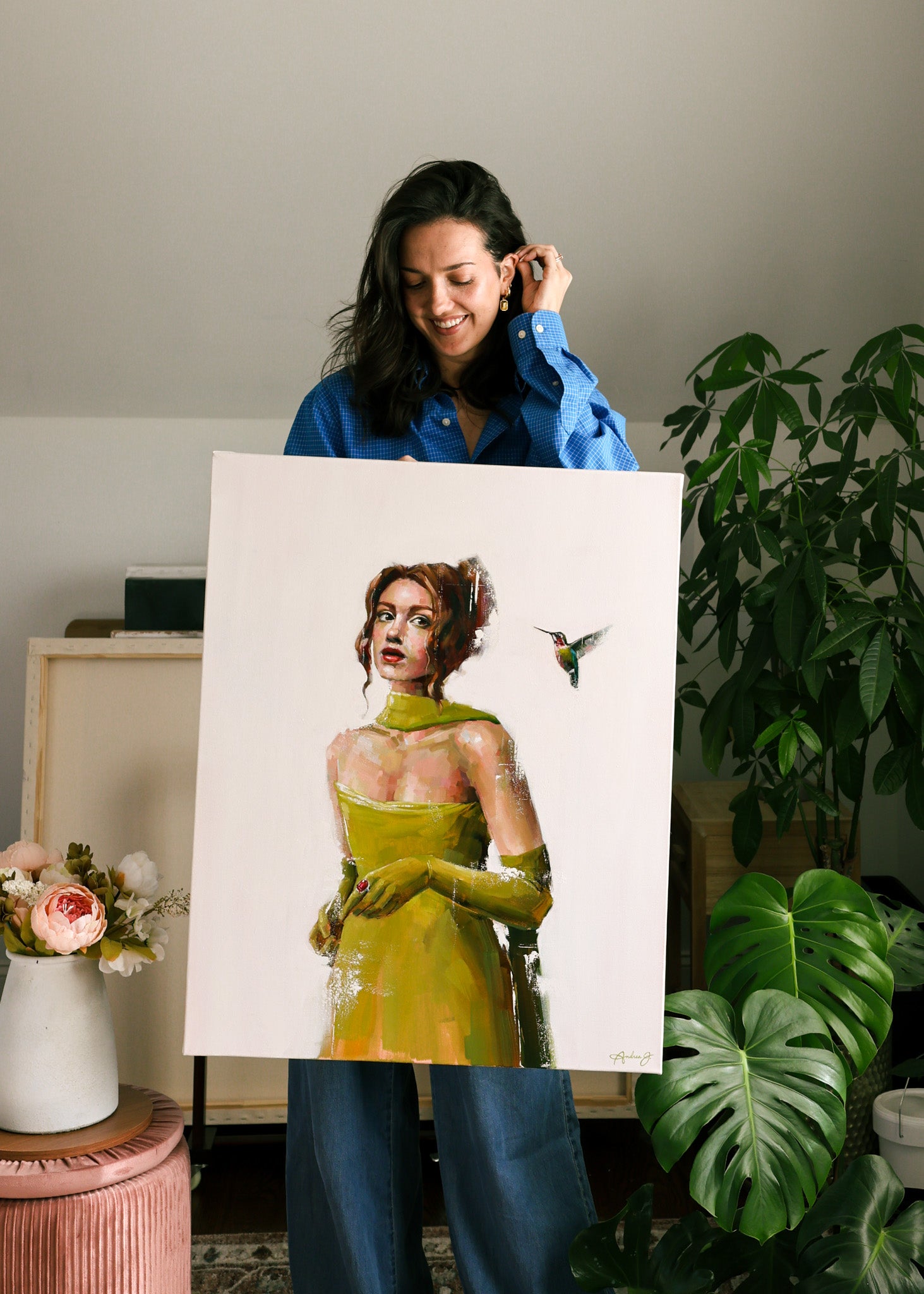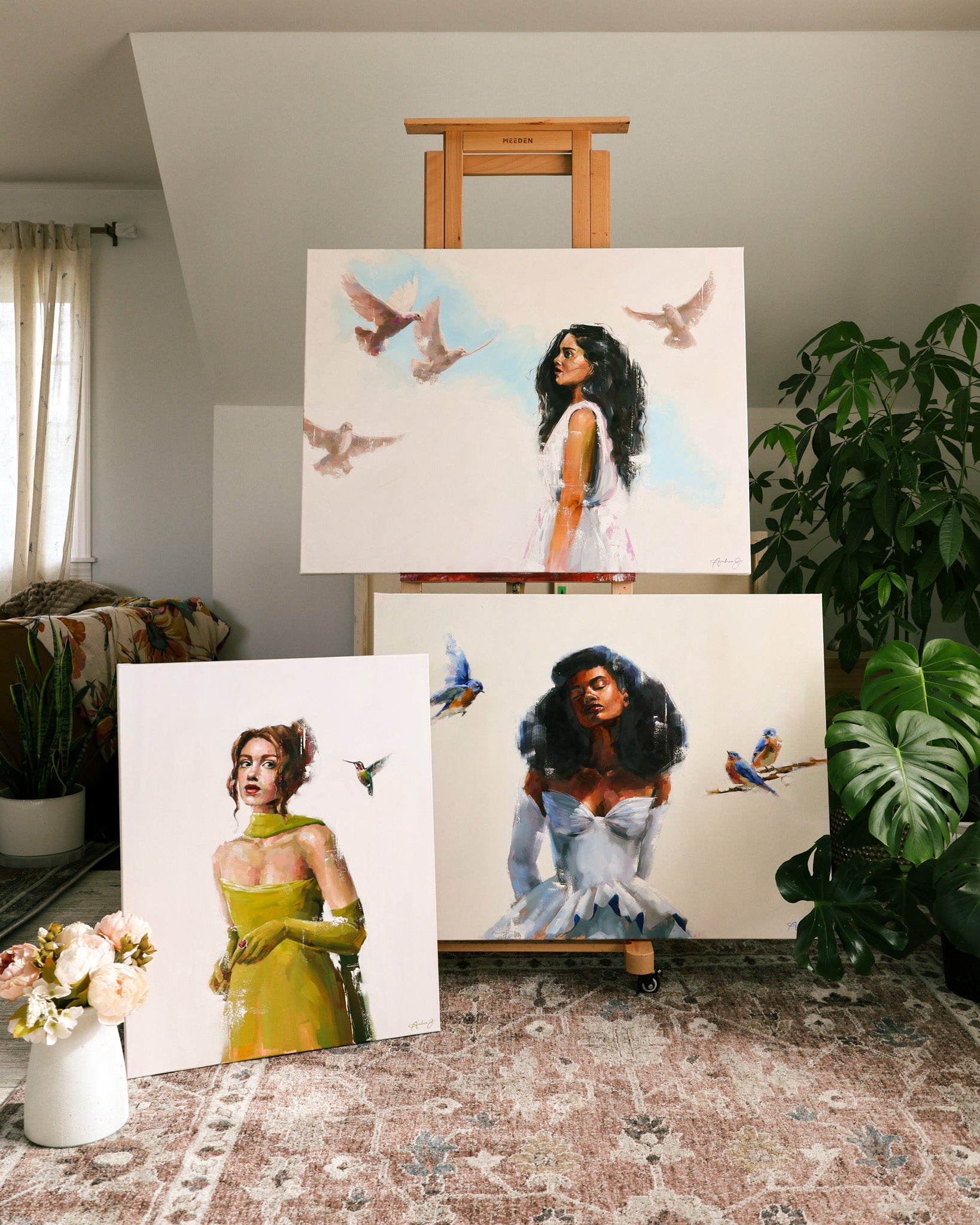 After a year-long pause from painting 100 women in dresses, the story of Chapter 6, New Wings, is finally ready to be told. This chapter shares the journey of shedding the costumes we wear in the name of fitting in, finding our own unique wings in the process of self-discovery, and finally experiencing the freedom of embracing who we were always meant to be. Inspired by my own journey of working through performance & perfectionism, my hope is that this series will help others find their own unique wings, as well as the courage to use them.